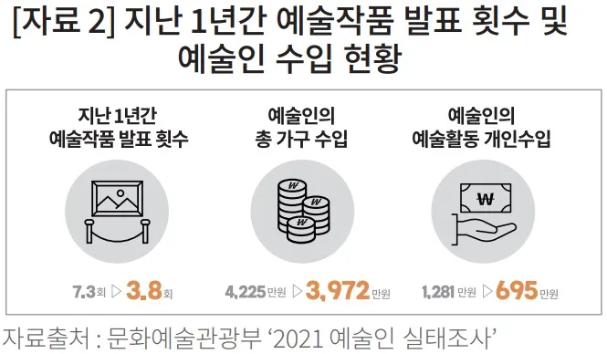 일반 군민과 달리 문화예술인만을 특별히 지원할 이유가 없다는 주장이 있을 수 있다. 그러나 문화체육관광부가 실시한 ‘2021년 예술인 실태조사’에 따르면 문화예술인들의 연평균 수입은 695만 원에 불과하다. 같은 자료에 따르면 예술인의 가구 총 수입도 일반 가구에 비해 2천만 원 가까이 적다. 더욱이 경상권 예술인들의 예술창작활동 수입은 524만 원에 불과해 다른 지역에 비해 현저히 낮다. 또한 경상권은 예술창작 활동 수입이 0원인 예술인도 47.9%로 전국 평균 43%보다 높다. 하동군만을 대상으로 독자적인 조사가 이루어진 바는 없으나 전국적으로 월 100만 원 수입도 안 되는 예술인의 비중이 86.6%에 달한다는 자료로 볼 때 하동군 예술인들이 처한 상황은 더욱 심각하리라 짐작된다.