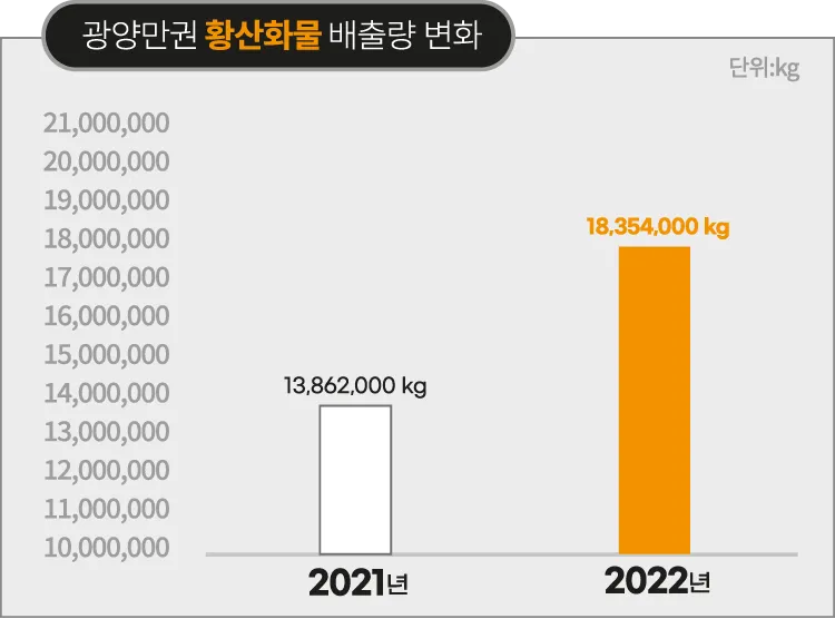 환경부가 2022년 대기오염물질 배출량 통계를 발표했다. 굴뚝 자동측정기기(이하 ‘TMS’)가 부착된 대형사업장 887곳의 통계이다. 전국 대기오염물질 배출량은 21만 5205톤으로 2021년보다 2만 3380톤, 12.2% 늘었다. 광양만권은 4만 2,167톤으로 2021년보다 6,184톤, 17% 늘었다. 사업장별 대기오염물질 배출량 1위는 POSCO 광양제철소로 2만 824톤, 8위는 하동화력발전소로 7136톤이다.