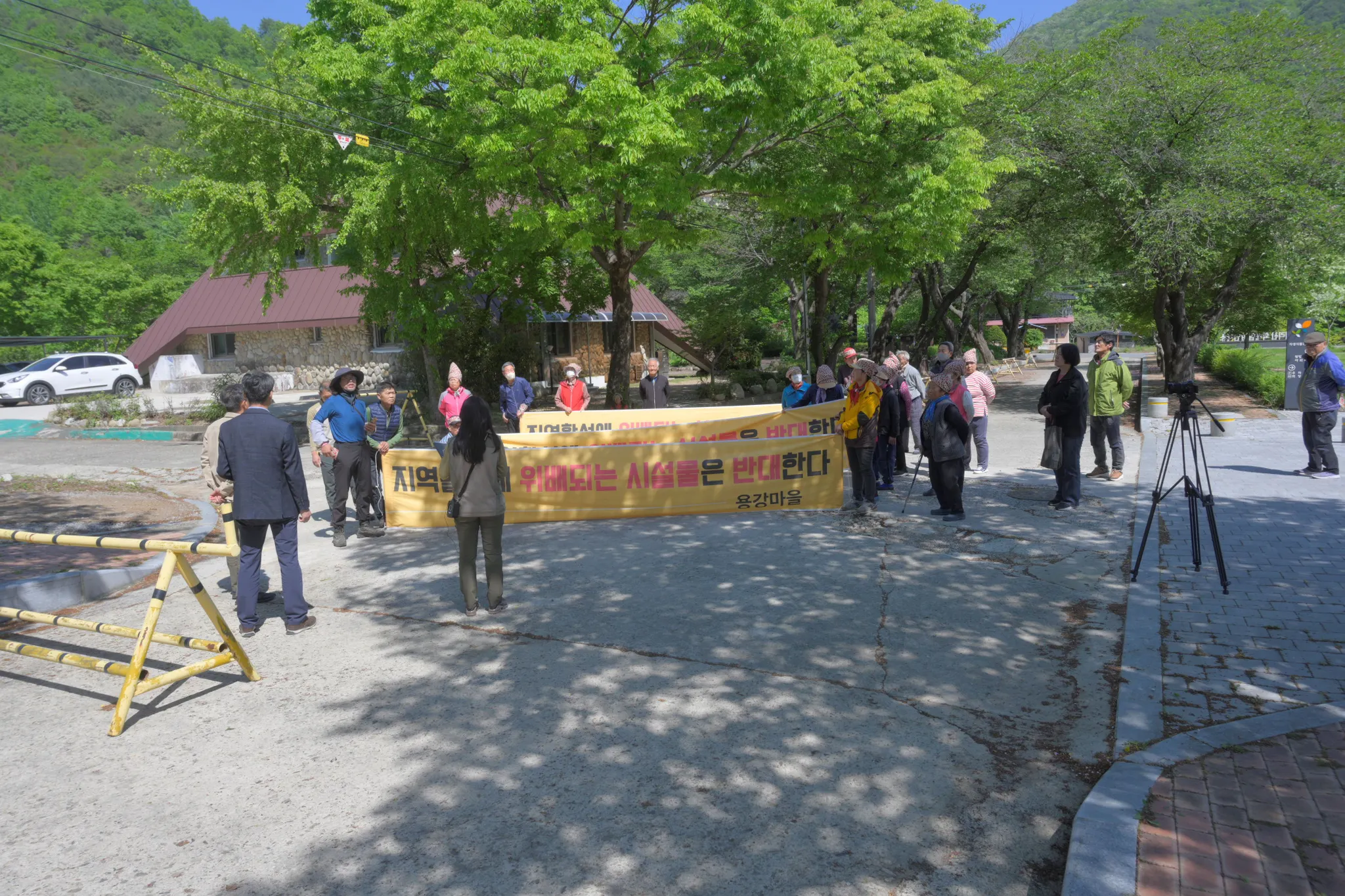 지난 4월 26일 수요일 오후 2시경, 국립공원공단 지리산국립공원 하동분소(이하 하동분소) 앞에 용강마을 주민 30여 명이 현수막을 들고 항의에 나섰다. 같은 시각, 국립공원공단에서 추진하는 자생식물증식장 조성사업의 현장 설계가 진행되었고 주민들도 현장에 참석했다. 항공촬영용 드론이 떠서 하동분소 및 용강마을 주변을 촬영했다.