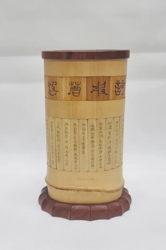 송광사 금죽헌에서 29년 동안 만들었던 작품은 모두 불타 없어지고, 오직 하나 남은 당시 서울, 국가무형문화재 전수회관에서 전시 중이던 ‘낙죽 반야심경’ 필통
