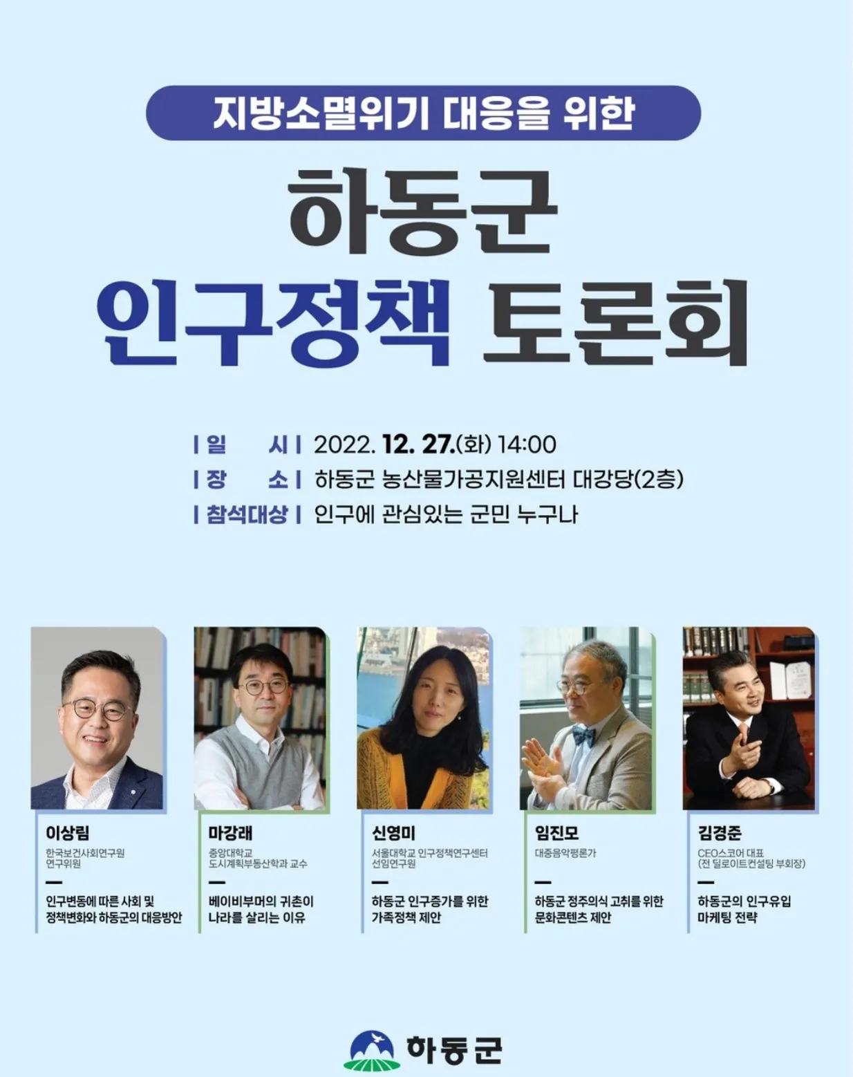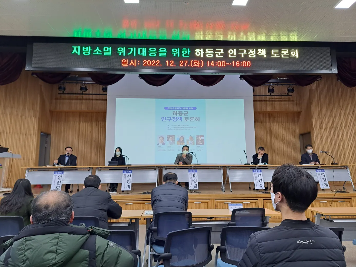 지난 12월 27일, 적량면 농산물 가공 지원센터에서 하동의 지역소멸 위기 대응 방안을 모색하는 ‘하동군 인구정책 토론회’가 열렸다. 군민, 군의회 의원, 도의원, 하동군수를 포함한 공무원 등 약 150여 명이 참석했다. 토론회에는 이상림(한국보건사회연구원 연구위원), 마강래(중앙대학교 도시계획부동산학과 교수), 신영미(서울대학교 인구정책연구센터 선임연구원), 임진모(대중음악 평론가), 김경준(전 딜로이트컨설팅 부회장) 등 여러 분야의 전문가가 초청되었다.