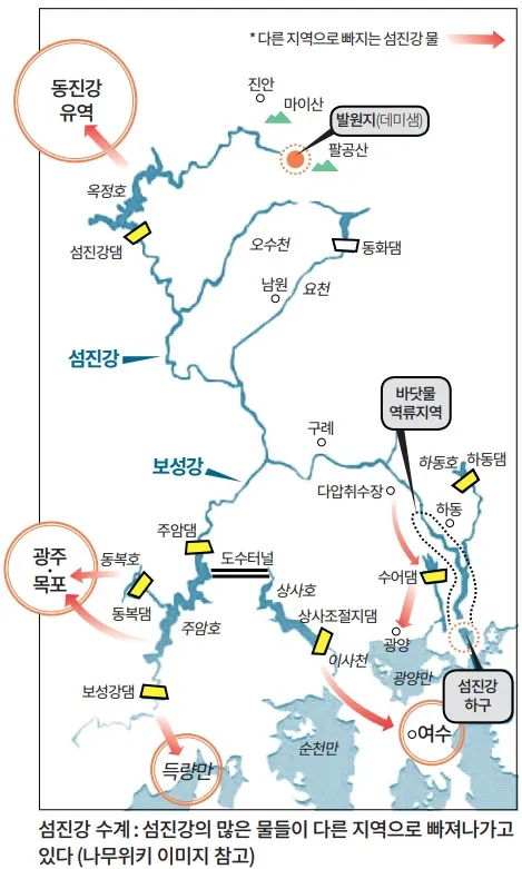 강물은 언제부터 왜 줄어들었는가? 섬진강댐과 주암댐이 섬진강 물을 막았고, 광양 다압취수장에서 섬진강물을 빼갔다.