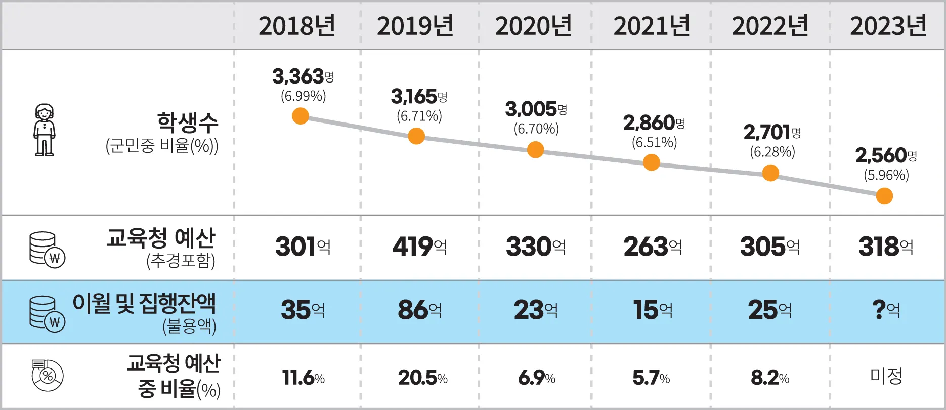 학생수는 꾸준한 추세로 줄어드는데 비해 교육예산은 들쭉날쭉하지만 평균 300억 원 안팎을 유지하고 있다. 주목할 것은 이월 및 집행잔액, 즉 불용액(不用額)이다. 한해 예산을 다 쓰지 못하고 다음 해로 넘기는 불용액이 교육예산의 5.7%(2021년, 15억 원) ~ 20.5%(2019년, 86억 원)에 이른다. 학생수에 비해 교육예산이 과도하게 많다는 항간의 비판이 설득력을 얻는 지점이다.