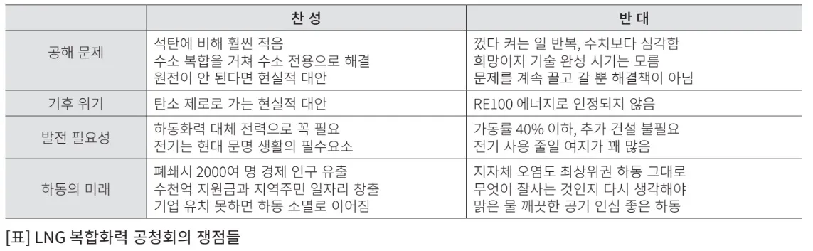 필자가 기본적으로 반대 입장에 있기 때문에 그날 있었던 토론 내용을 객관적으로 정리하기엔 한계가 있지만 이해를 위해 정리해보면 위 <표>와 같다. 이를 다시 간단하게 정리하면 찬성 쪽은 하동화력이 하동 경제를 위해 꼭 필요했고 많은 도움을 주었으므로, 복합화력발전소로 이어가야만 그나마 하동이 소멸위기에서 벗어날 수 있다고 주장한다. 반면 반대쪽은 하동화력이 하동 경제에 도움을 준 건 사실이라 할지라도 얻은 것보다는 잃은 게 훨씬 더 크므로, 하동화력이 문을 닫는 시점을 오히려 기회로 삼아야 한다. 아울러 꼭 다시 지어야 한다면 지금까지 하동화력이 보여온 고압적이고 폐쇄적인 운영행태에 대해 제대로 사과하고, 심각한 주민 고통에 대한 진정한 사과와 대책 마련이 앞서야만 다시 논의를 시작할 수 있다는 것이다.