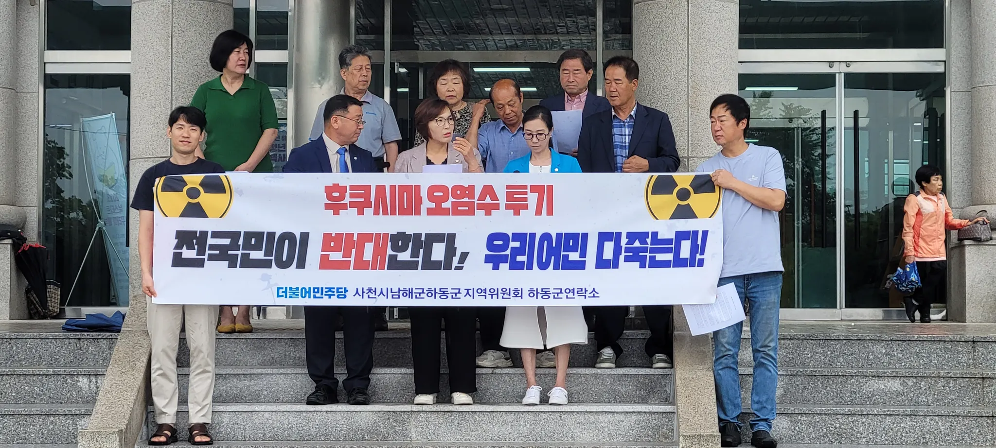지난 7월 7일 하동군청 앞에서 더불어민주당 하동군연락소(소장 이강현)의 후쿠시마 오염수 투기 반대 기자회견이 있었다. 하동군연락소는 “일본 정부는 후쿠시마 오염수 해양투기 계획을 철회하고, 윤석열 정부는 오염수 해양투기 저지를 위해 국제해양재판소에 제소해야 하며, 하동군과 하동군의회는 후쿠시마 오염수 해양투기 반대의사를 즉각 밝히라”고 촉구했다. 이어 “많은 주민이 수산업에 종사하고 있다”며 “하동군도 더 이상 정부의 대책만 바라보지 말고, 후쿠시마 오염수가 투기되지 않도록 국제사회와 공조할 것을 정부에 요구해야 한다”고 촉구했다.