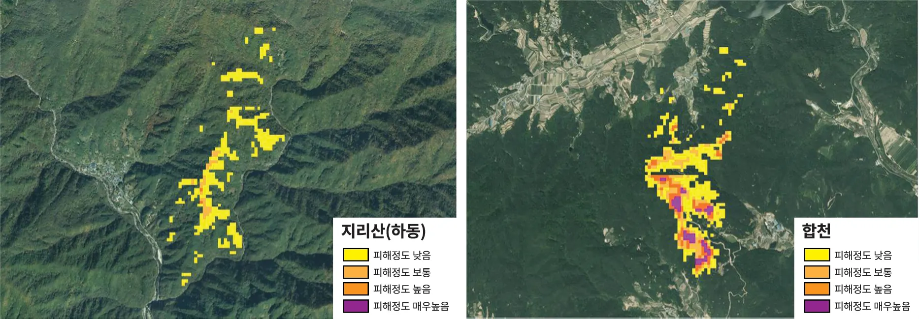 [자료 2] 위성영상을 활용한 화개-합천지역 산불 강도 분석 / (좌)화개 산불, (우)합천 산불 (부산대학교, 2023)