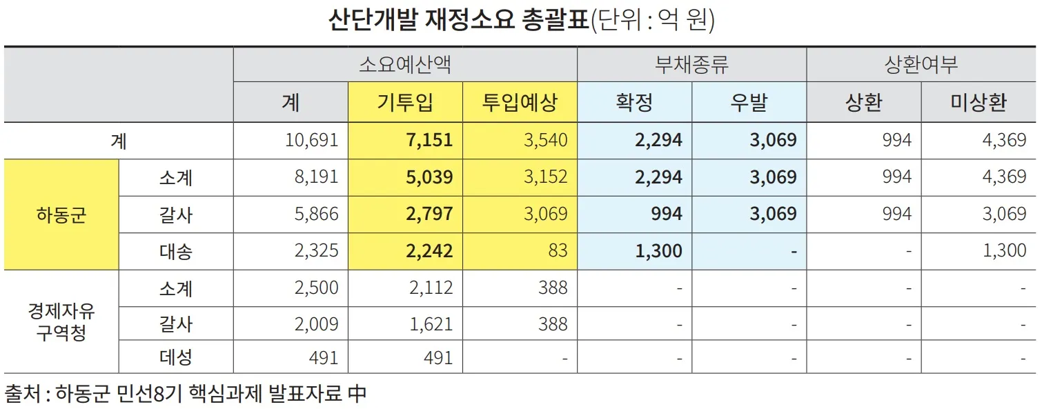 민선 3, 4, 5기와 6, 7기 하동군수를 지낸 두 사람의 선거 당시 핵심 공약은 갈사·대송산단 개발과 인구 15만 하동시 건설이었다. 하지만 그들이 하동군수로 있었던 20년이란 기간 동안 남은 것은 4,369억 원의 빚뿐이다. 그리고 그 빚을 갚기 위해 꼭 지출되어야 할 예산까지 삭감되어 고통을 나누고 있는 것이 지금 하동의 현실이다. 조유행 전군수와 윤상기 전군수는 서로 잘못을 따질 것이 아니라 이와같은 사태를 만든 장본인으로서 책임을 져야 한다.